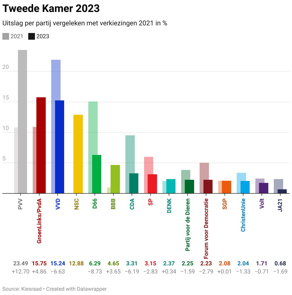 De Tweede Kamerverkiezingen van november 2023 lieten een grote electorale verschuiving zien. Niet alleen werd de uiterst-rechtse PVV verreweg de grootste partij, ook nieuwkomer NSC wist 20 zetels te winnen. GroenLinks en PvdA deden voor het eerst samen mee aan een landelijk verkiezing en haalden 25 zetels. Voor de verkiezingen hadden deze partijen samen 17 zetels.