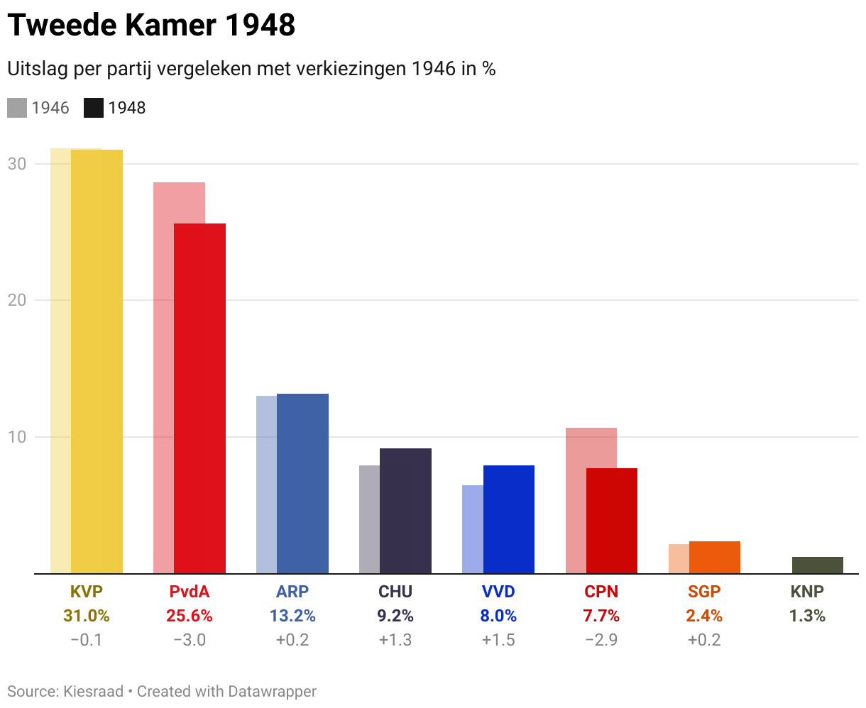 De 100 zetels werden verdeeld in een evenredig kiesstelsel. De KVP en de PvdA waren opnieuw de grootste partijen, met 32 en 27 zetels respectievelijk. Nieuw in de Tweede Kamer waren de VVD (als opvolger van de Partij van de Vrijheid) en de Katholiek Nationale Partij (KNP). De KNP verzette zich tegen het onafhankelijk worden van Indonesië.